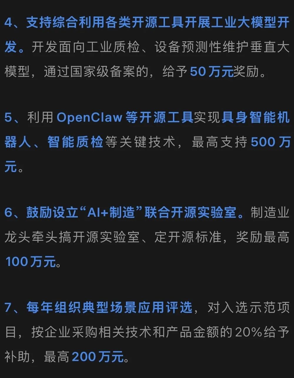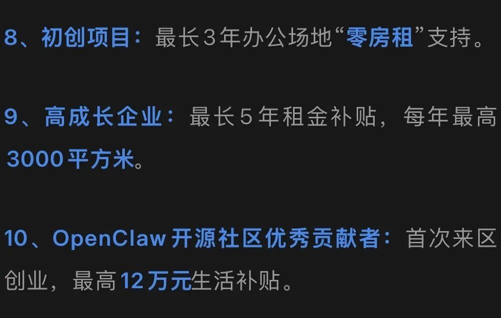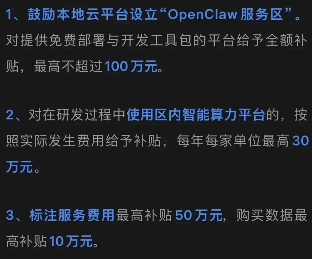 这里提到的“龙虾”,是一个名叫OpenClaw的开源AI智能体,因为图标是只红色龙虾,被网友亲切地称为“龙虾”,并形象地将训练使用这一软件称为“养龙虾”。无锡“养龙虾”12条涉及不少真金白银补贴,比如:对提供OpenClaw免费部署与开发工具包的平台,给予最高100万元补贴;OpenClaw开源社区优秀贡献者,首次来区创业,给予最高12万元生活补贴;利用OpenClaw等开源工具实现具身智能机器人、智能质检等关键技术,最高支持500万元等。▲无锡“养龙虾”12条官方报道截图