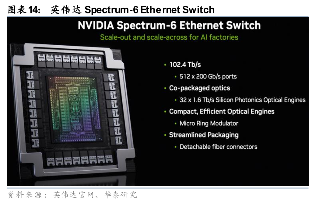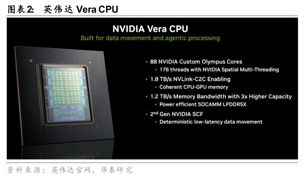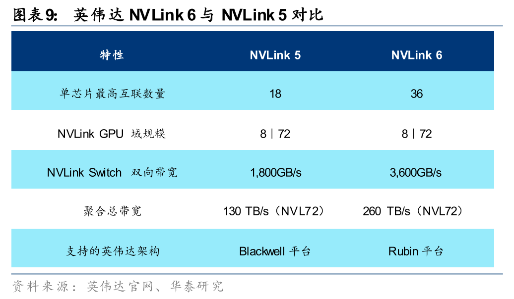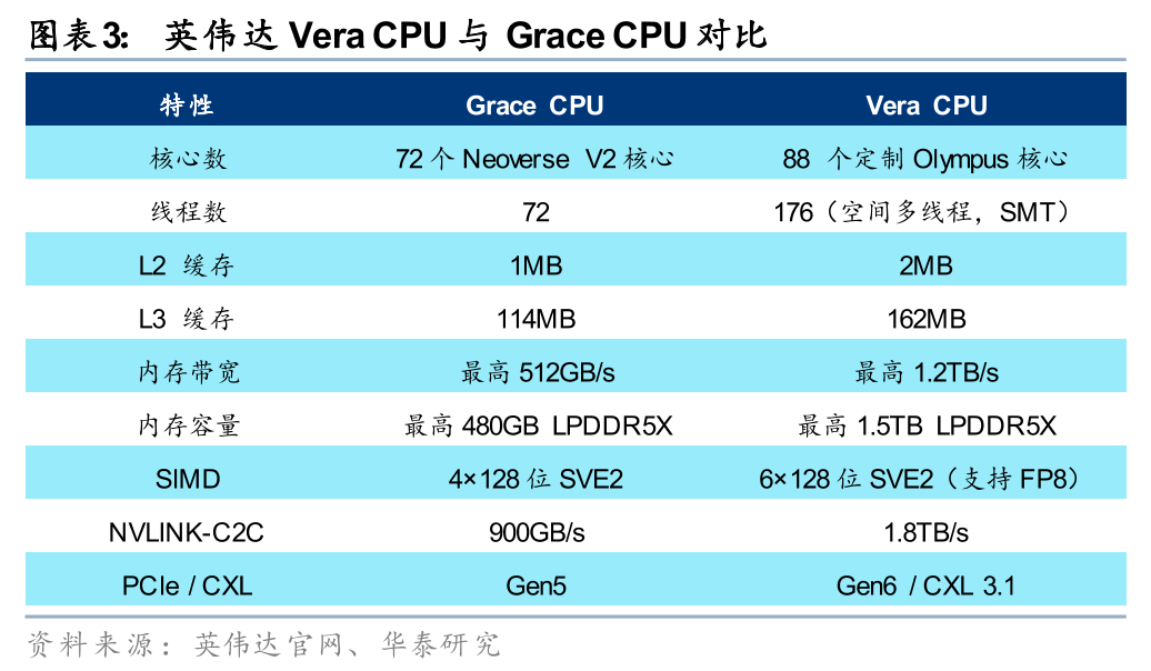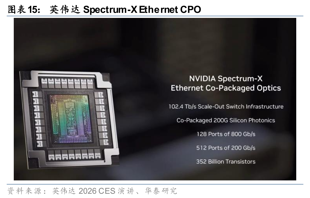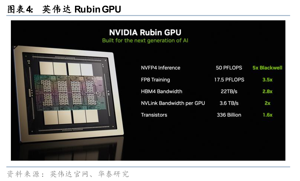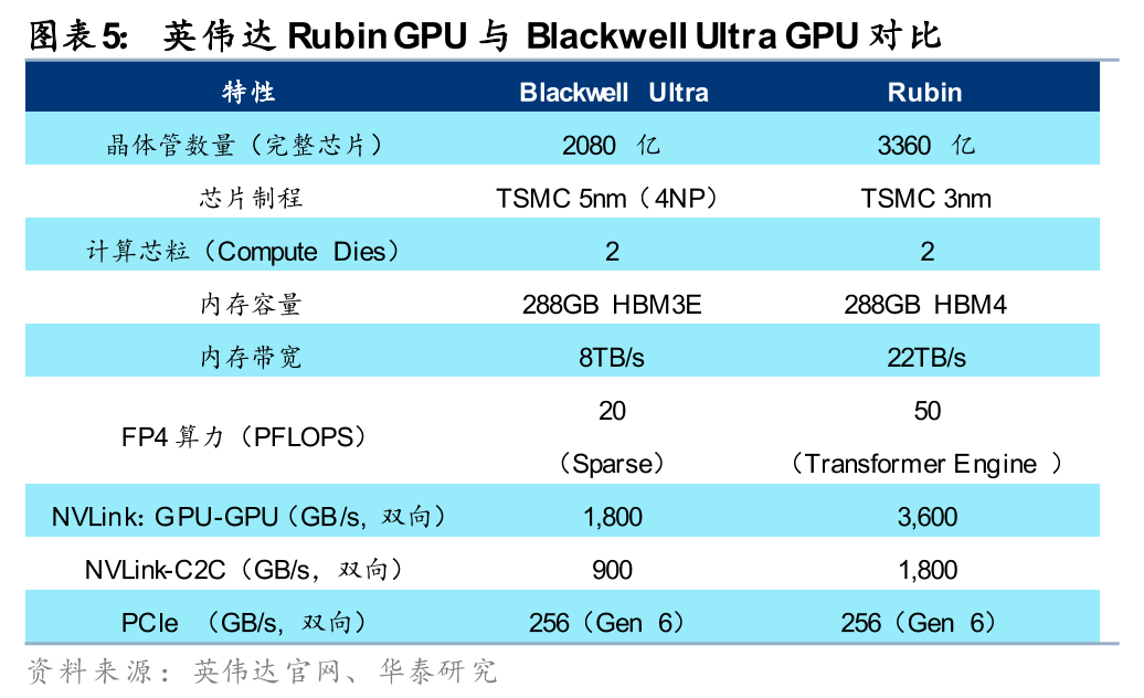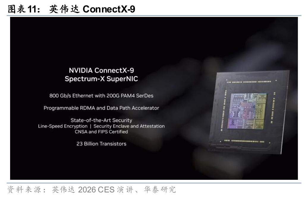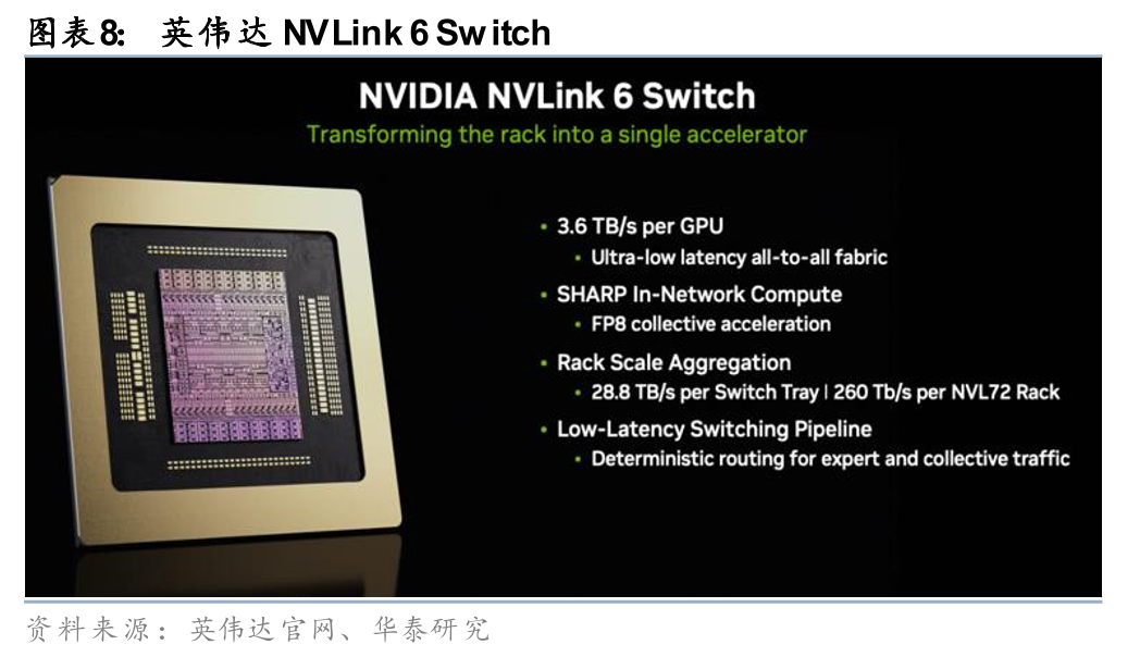 VR平台的6款核心产品包括:1)Rubin GPU配置288GB HBM4,带宽达22TB/s,对比B300的288GB HBM3E,8TB/s带宽。FP4推理能力达50PF(Transformer Engine,对比B300 Sparse的20PF),训练能力35PF。2)Vera CPU采用88个定制Olympus核心(Armv9.2) 空间多线程(SMT)设计,搭配1.5TB LPDDR5X,并以1.8TB/s NVLink C2C链接Rubin GPU。3)NVLink6 Switch将双向互联带宽提升至3.6TB/s(NVLink5为1.8TB/s),VR NVL72机柜总带宽约260TB/s,显著增强机架内部的数据交换能力。在SHARP网络侧计算方面,单个NVLink6 Switch tray可提供约14.4 TFLOPS FP8算力用于通信加速。4)VR NVL72机柜中,每个Compute tray配置四颗ConnectX-9 SuperNIC,为单颗Rubin GPU提供最高约1.6Tb/s的网络带宽;相比之下,GB300 NVL72采用 CX8,网络带宽约为800Gb/s。5)BlueField-4集成64核Grace CPU、128GB LPDDR5X内存与CX9网络,并提供最高800Gb/s超低时延以太网或InfiniBand链接能力。6)Spectrum-6基于200G PAM4 SerDes将单芯片交换带宽提升至102.4Tb/s;英伟达还重申Spectrum-X CPO方案,可实现5倍能效提升。