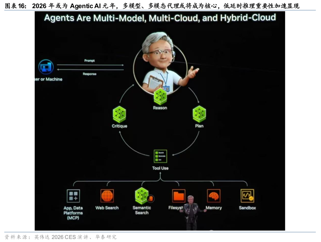 我们认为在2025年成为Physical AI元年之后,2026年或将为Agentic AI落地元年。Meta对Manus的收购以及英伟达对Groq的部署,分别从软件与硬件层面印证此趋势。在持续巩固AI训练与大规模推理的同时,英伟达吸收Groq在低时延、确定性推理方面的能力,与自身高吞吐GPU架构形成互补,前瞻布局Agentic AI,定义AI“下半场”。