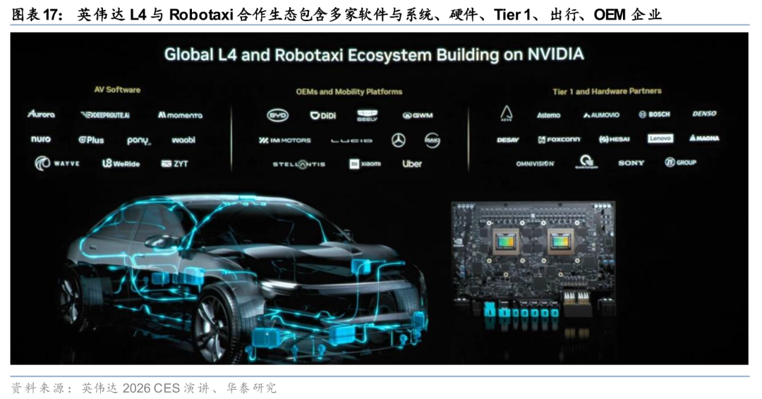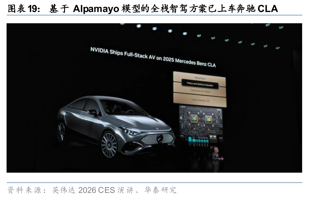 CEO黄仁勋重申,物理AI(机器人,自动驾驶)将成为AI的重点演进方向。其判断未来车辆将以L4自动驾驶为主流形态,包括Robotaxi与私家车两大场景。基于此,英伟达正加速推进自动驾驶战略,与Robotaxi运营商及整车OEM深化合作,推动其AI芯片与DRIVE AV软件栈于2027年前后实现L4规模化落地。本次CES,英伟达发布Alpamayo开源模型,采用基于思维链(CoT)的推理型VLA架构,定位为“教师模型”,不直接部署于车端,而用于支持开发者对自动驾驶系统进行微调与蒸馏。我们认为,该产品目前主要面向OEM的高级ADAS场景,例如奔驰的CLA正采用基于英伟达AV软件栈(Alpamayo模型、Halos安全系统等)及硬件的全栈智能驾驶方案。