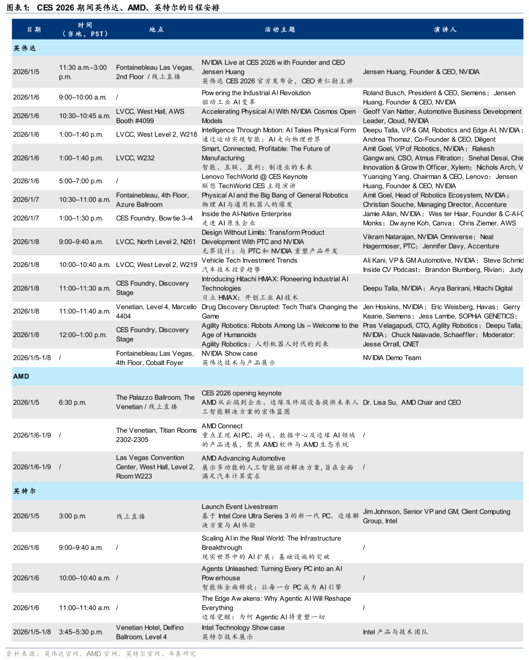 在CES 2026上,AMD与英特尔均发布演讲,并阐述下一阶段AI战略。AMD/英特尔1/6收盘表现分别跌约3%/涨约2%,或因AMD未发布新数据中心相关内容,英特尔成功验证18A执行力。我们认为2026年AI投资重心为:1)或从物理AI转向Agentic AI,关注推理、实时响应所带来的算力需求结构变化;2)或从数据中心算力扩张,转向全场景落地渗透,关注客户端、边缘侧,以及工业、医疗等垂直场景的需求渗透。
