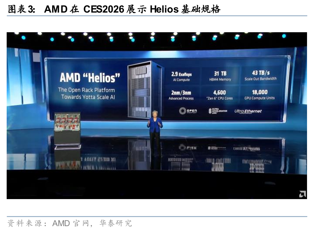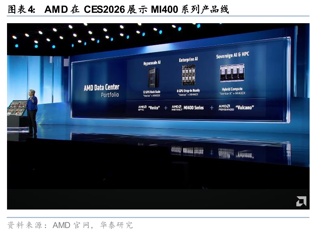 AMD CEO于美东时间1/5进行CES 2026主题演讲,发布MI400系列平台,并引入下一代MI500:1)正式展示其面向Yotta-FLOPS级AI基础设施的Helios机架级平台,Helios基于OCP Open Rack Wide标准,集成72个 MI455X GPU,配备总计31TB HBM4,聚合内存带宽达1.4PB/s,scale out带宽达43TB/s;每个计算托盘搭载4个MI455 GPU,搭配Venice EPYC CPU和800Gb Pensando网络芯片,并采用液冷方案,公司预计将于26H2开始出货。2)发布专为企业本地化部署设计的MI440X平台,搭载1个Venice EPYC CPU与8个MI440X GPU,支持FP4、FP8和BF16等,在供电与散热方面保持与现有数据中心兼容,此前披露的MI430X面向主权AI和HPC,支持FP32和FP64。3)预告MI500将于2027年推出。