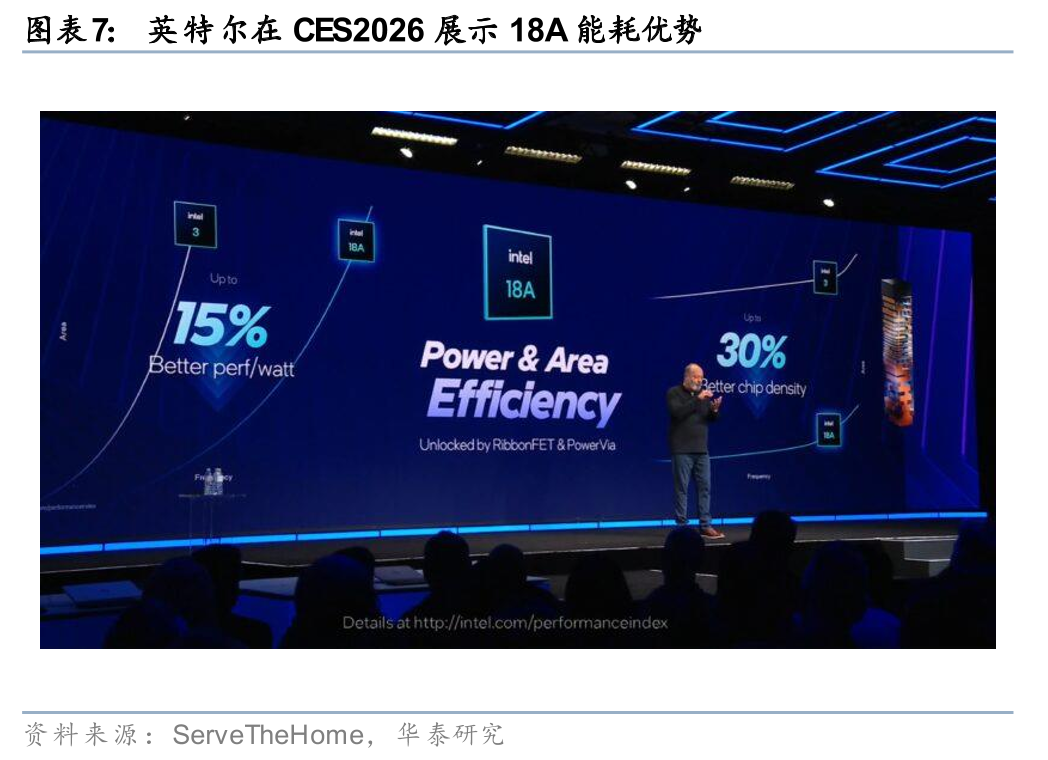 英特尔强调18A是全球首个同时引入RibbonFET全环绕栅极晶体管与PowerVia背面供电技术的量产级制程。RibbonFET使晶体管电流控制更加精细,有利于在提升频率的同时压低功耗,PowerVia改善供电与信号完整性,为系统级能效释放空间。基于18A的产品在性能功耗比方面可实现约15%的提升,芯片密度提升超过30%。管理层将先进制程确立为与x86生态优势并列的战略,或有助于减轻市场对其制程执行力的疑虑。