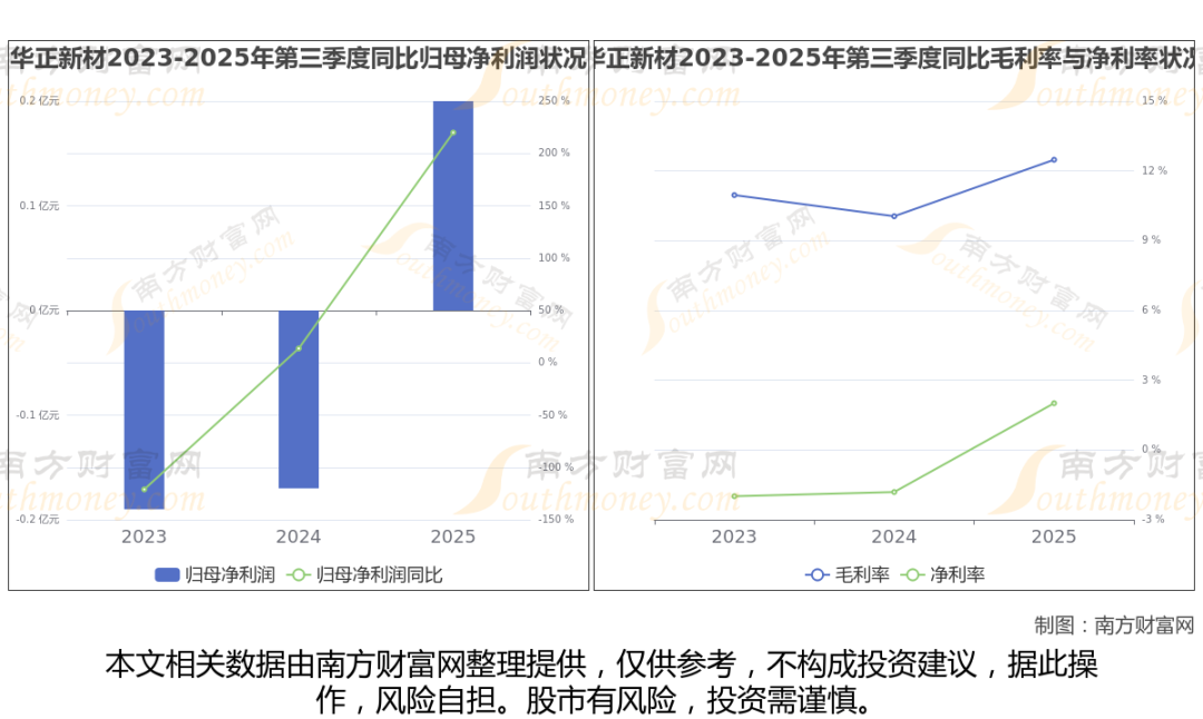 2025年第三季度季报显示,华正新材公司实现净利润1993.97万,同比上年增长率为219.99%,毛利率12.48%。