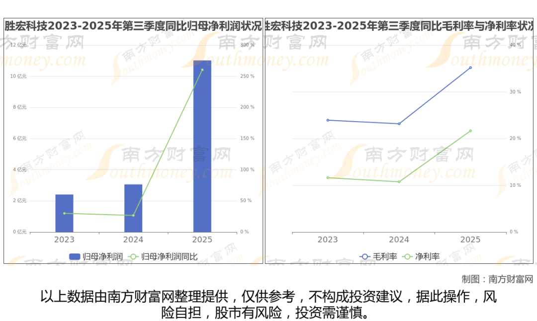 2025年第三季度季报显示,胜宏科技公司实现净利润11.02亿,同比增长260.52%;毛利润为17.9亿,毛利率35.19%。