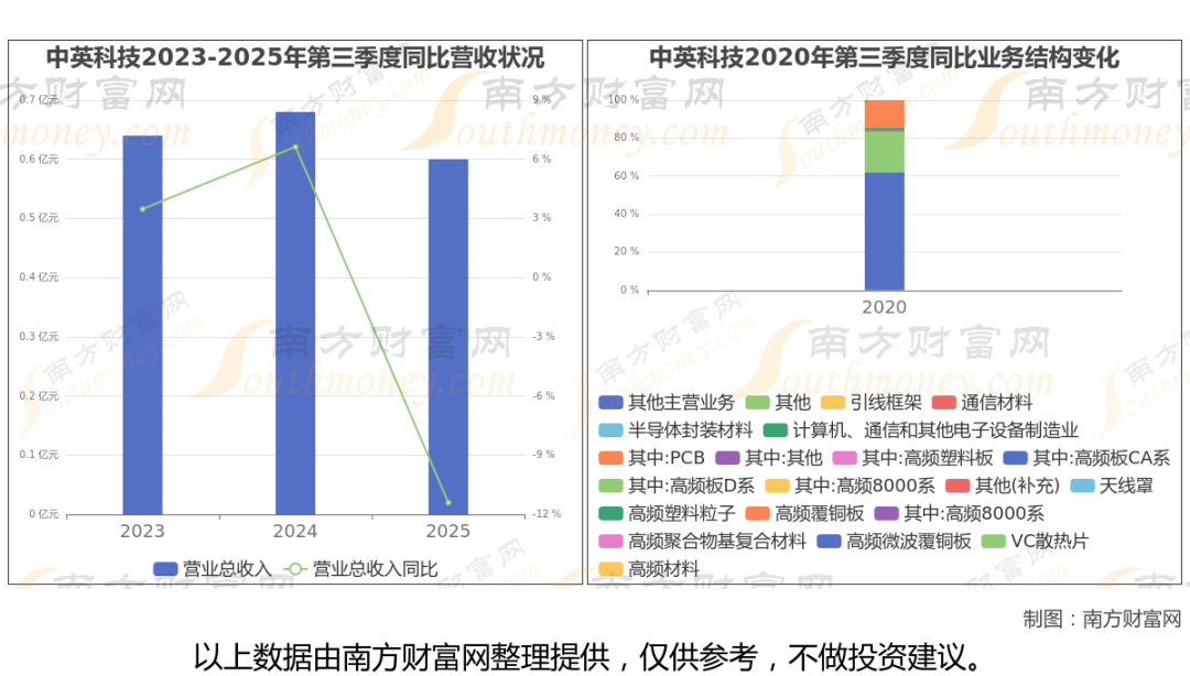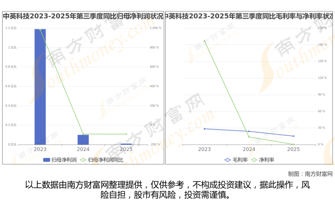 2025年第三季度季报显示,中英科技公司毛利率15.2%,净利率0.3%,归属净利润76.77万,同比增长-92.1%。