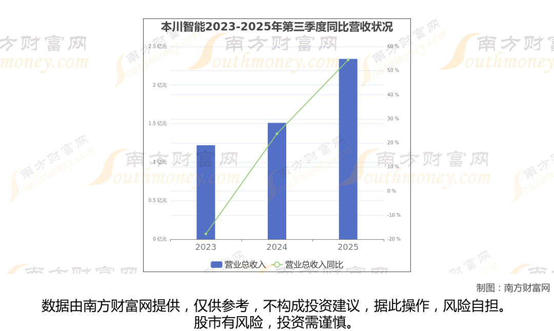 于2025年第三季度,本川智能披露了其业绩表现(如上图),其中主营业务收入2.34亿元,相较于去年同期54.47%。