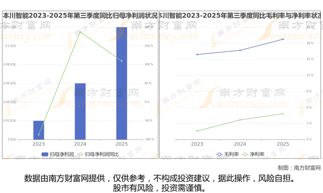 公司2025年第三季度季报显示,本川智能实现净利润1161.65万,同比增长109.52%;毛利润为4382.51万,毛利率18.74%。