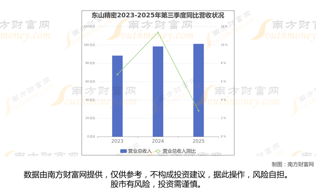 东山精密2025年第三季度报告显示(如上图),公司实现主营业务收入101.15亿元,较去年同期增长2.82%。