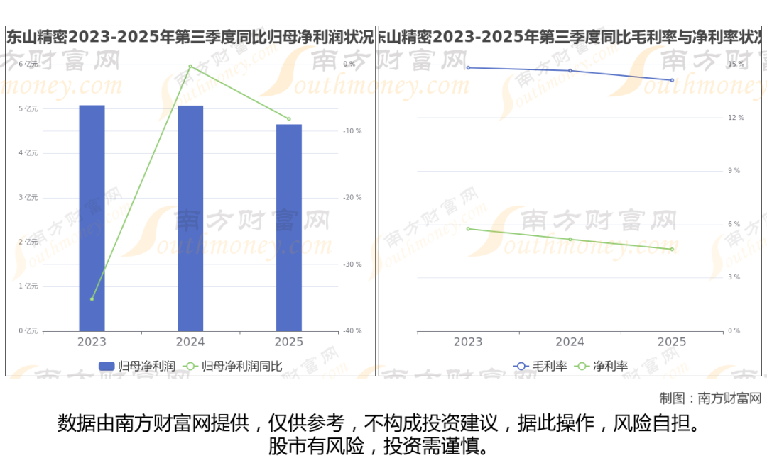 公司2025年第三季度季报显示,东山精密实现净利润4.65亿,同比增长-8.19%;毛利润为14.28亿,毛利率14.11%。