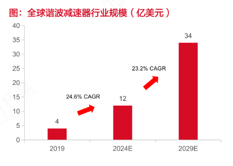 谐波减速器:2024年全球谐波减速器市场规模超过12亿美元,年均复合增速(CAGR)超过20%。