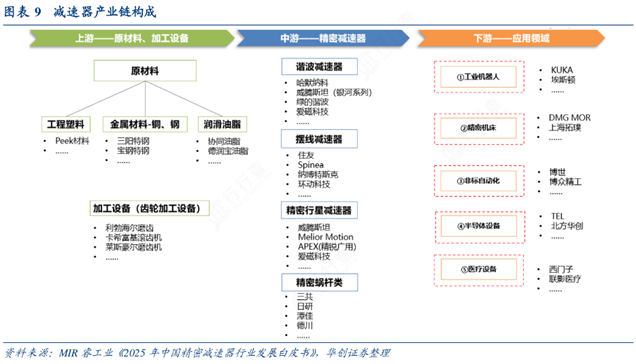 减速器下游应用领域广泛,涵盖工业机器人、精密机床、非标自动化、半导体设备和医疗设备等。在人形机器人产业链中,减速器作为连接“动力源”与“执行端”的核心传动中枢,其技术性能与成本控制直接影响中游整机的商业化可行性,同时也反向推动上游材料与设备的技术迭代,最终决定下游场景的落地效率。