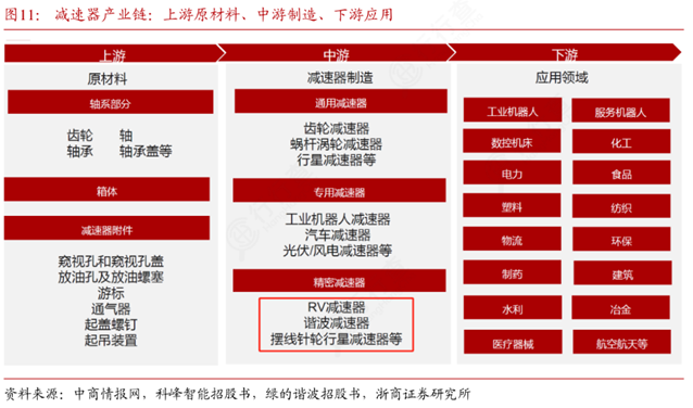 中游专注于精密减速器的生产,主要包括谐波减速器、摆线减速器、精密行星减速器和精密蜗杆类减速器。