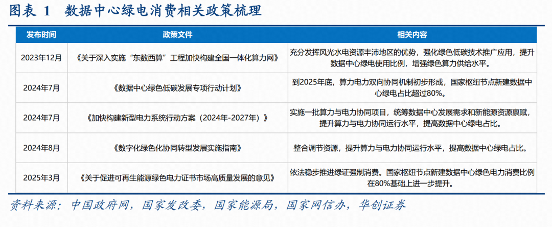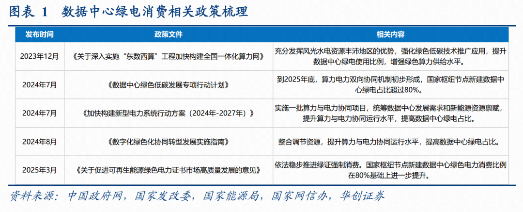 政策端加码驱动数据中心绿色低碳转型,绿电消费比例要求持续提升。
