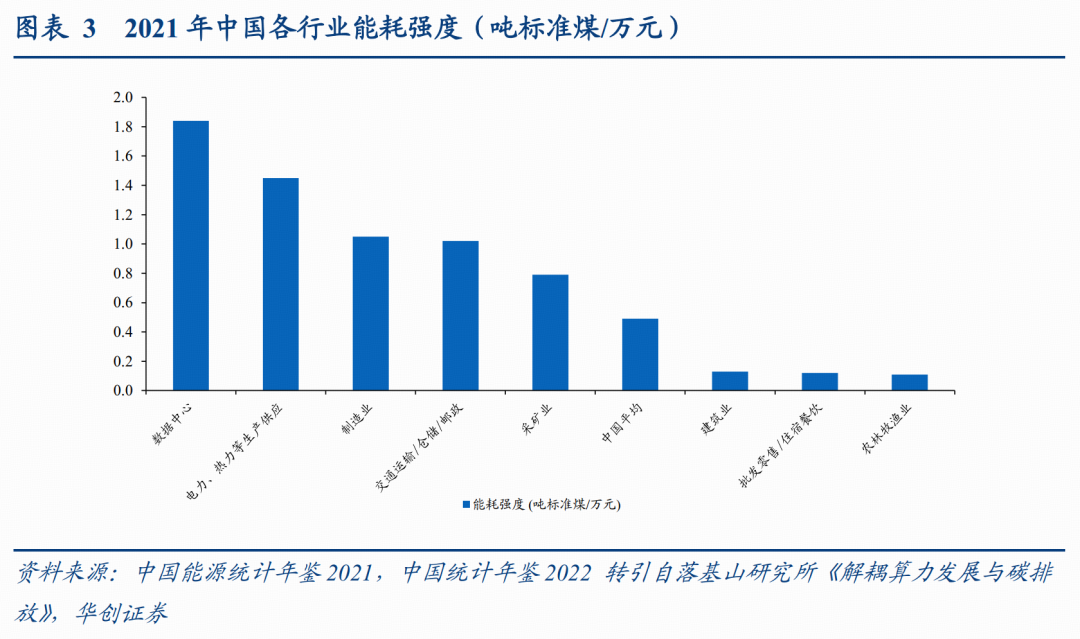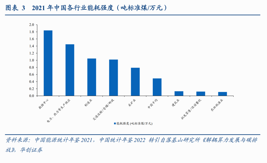 “十三五”规划以来,我国实施耗双控制度并将指标分解至各级地方政府,数据中心作为新型高耗能行业的特性正面临更严格的节能审查约束。根据中国能源统计年鉴2021数据,我国数据中心的能耗强度显著高于制造业,甚至超过电力、热力等传统高耗能行业。伴随AI的规模化应用推动数据中心用电需求井喷,任何新建数据中心都需要依据《固定资产投资项目节能审查办法》进行能耗评估,能耗双控指标成为决定算力部署能否落地的前置门槛。