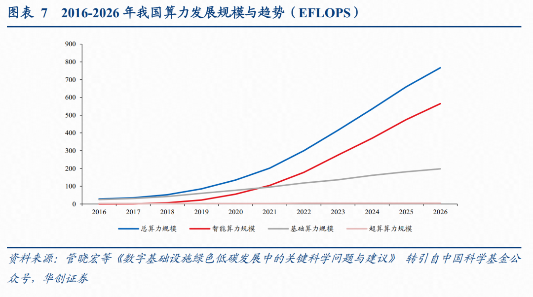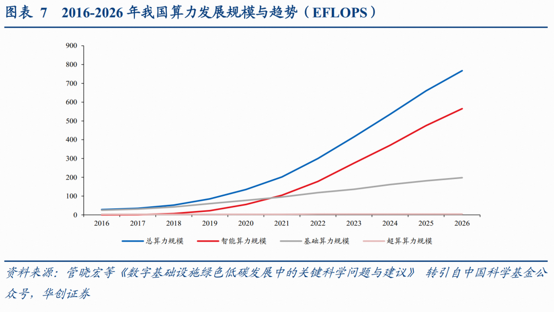 回顾历史,2016~2021年是我国算力规模的稳步增长期,主要由云计算、短视频、移动支付等消费互联网应用驱动。自2022年起,AI大模型的爆发式增长驱动算力规模继续增长,根据管晓宏等《数字基础设施绿色低碳发展中的关键科学问题与建议》,2026年我国算力总规模将达到767 EFlops,2021~2026年CAGR约为31%。此外,我国算力结构也在发生改变,智能算力的占比将从2016年的3%提升至2026年的73%,占比提升较为显著。