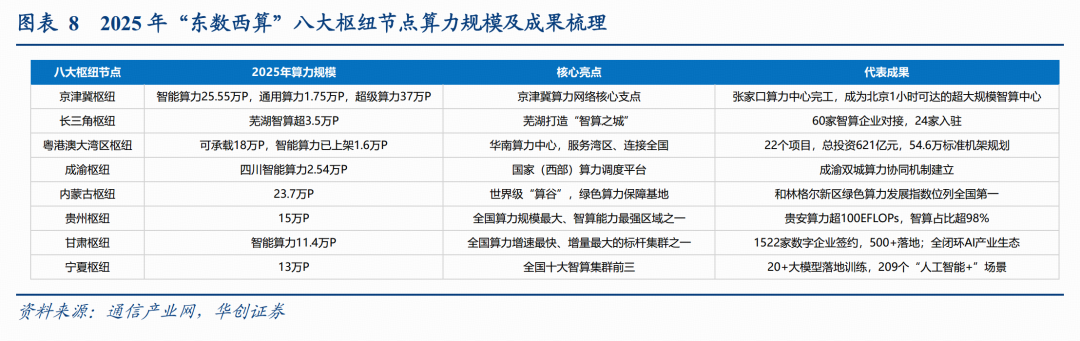 我国“东数西算”八大枢纽节点算力规模持续扩张,其中东部强化协同与智算转型,西部则发挥能源优势承接海量算力。