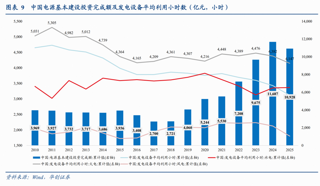 目前我国电力整体供需结构相对宽松,电源端大规模投资有效缓解了电力紧缺压力,但局部区域仍面临电力调配挑战。我国电源基本建设投资经历了一轮高峰,由2018年的2,721亿元提升至2024年11,687亿元,CAGR约为27%,2025年回落至10,928亿元。受此轮投资高峰带动,电力供给能力迅速扩张,导致各电源类型平均利用小时数出现趋势性下滑,其中火电利用小时数从2011年5,305小时的高位回落至2025年的4,147小时,风电的利用小时数在近年也呈现明显走低态势。
