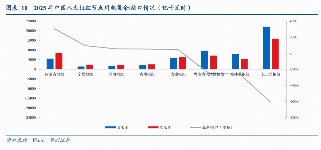 我国电力形势较优,电力供需结构相对宽松,但随着数据中心用电需求的持续抬升,部分区域仍面临缺电的风险,其中长三角枢纽节点2025年电力缺口高达6108亿千瓦时,以长三角为代表的高需求集群地区局部缺电压力正持续加大。