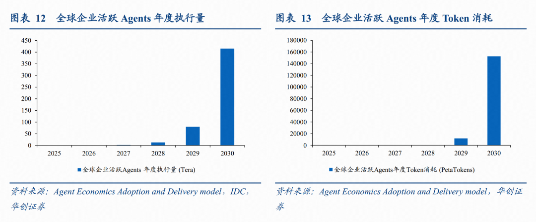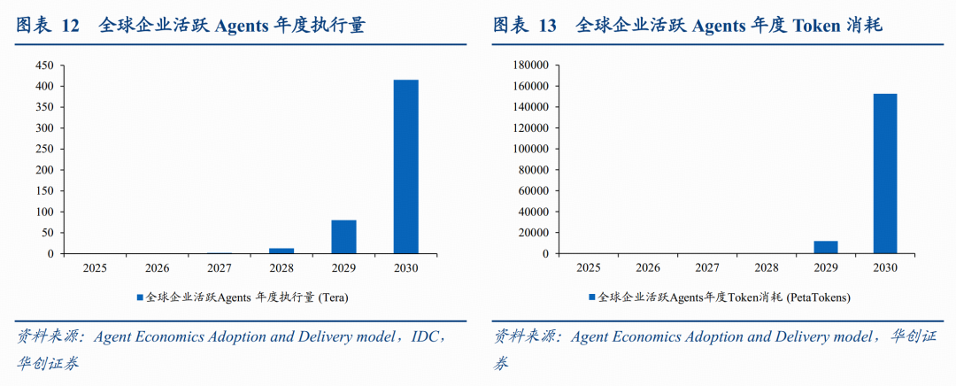 与传统的对话模式不同,Agent模式下的AI具备主动规划、多步拆解、自我反馈和长链路执行的能力,每个复杂的任务将被分解为成千上万个推理步骤。在Agent模式下,Token的消耗不再是与对话量成线性的,而是遵循“任务复杂度×执行时长”的指数级增长速度。根据IDC预测数据,到2030年,全球企业活跃Agents年度Token消耗将从2025年的极低水平暴增至152,667 Peta Tokens,呈现爆发式增长,与此同时其后台消耗的电量也在成倍增长。