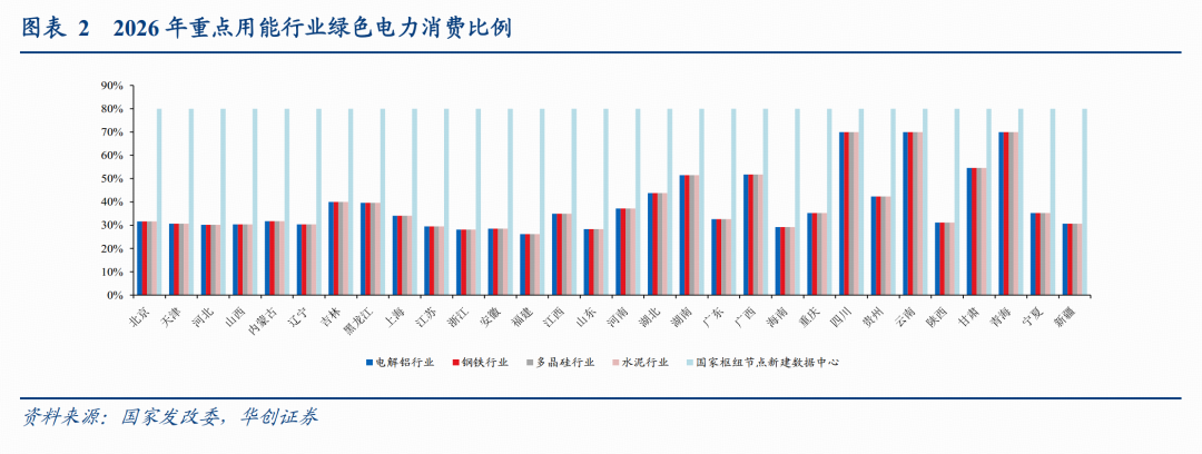 2025年7月,国家发改委、国家能源局发布《关于2025年可再生能源电力消纳责任权重及有关事项的通知》,国家枢纽节点新建数据中心被正式纳入绿色电力消费比例监测范围,其比例要求在全国30个省(自治区、直辖市)中均统一设定为80%。这一比例显著高于同期电解铝、钢铁、水泥及多晶硅行业在各地26%至70%不等的目标水平,体现了算力产业在能源转型中的引领地位。