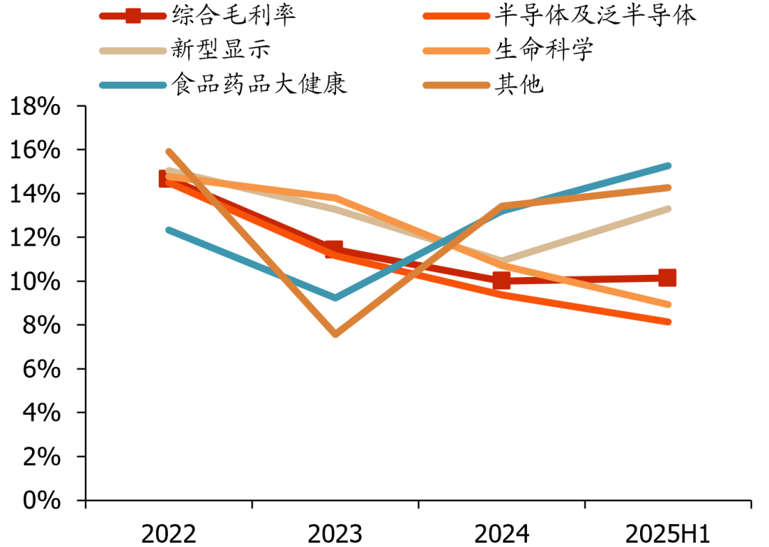 毛利率:2025Q1-3受益海外业务占比提升、项目成本管控优化,公司毛利率稳步恢复,后续随着海外规模扩张,盈利能力有望持续改善。预计2025-2027年综合毛利率分别为11.1%/10.9%/11.2%。1)半导体及泛半导体:下游需求改善叠加东南亚出海推进,盈利水平预计稳步上行,假设2025-2027年毛利率分别为10.0%/10.5%/11.0%;2)面板显示:25H1盈利能力明显提升,假设2025全年14%、2026-2027年12%(当前项目执行过后在高基数回落);3)生命科学、食药及其他:随着北美区域模块化产品推进,毛利率预计逐步提升,假设2025-2027年分别为12.0%/12.2%/12.4%。