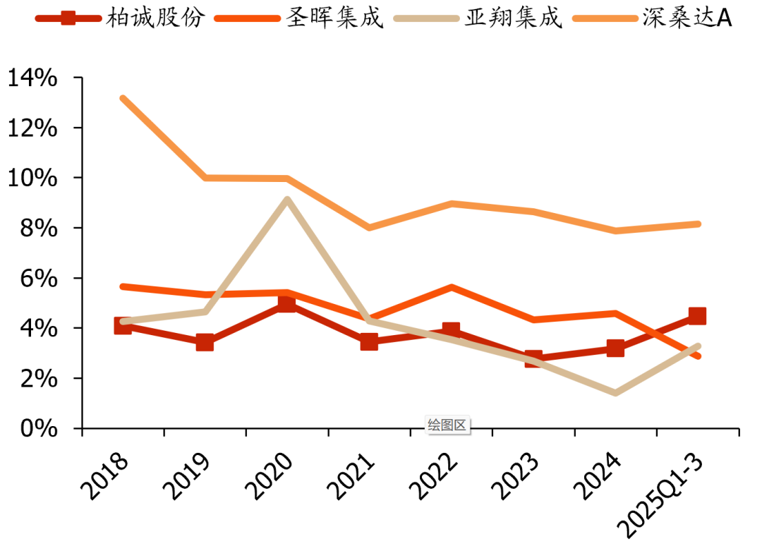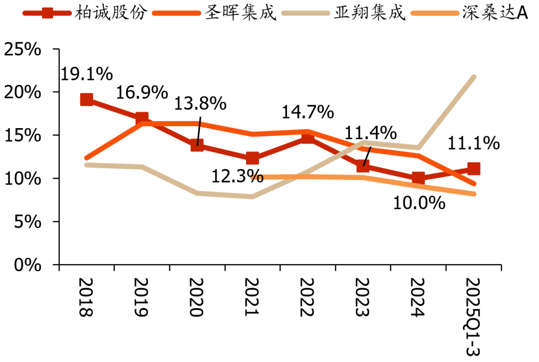 25Q1-3毛利率显著修复,海外占比提升有望促盈利改善。2018-2024年公司毛利率整体呈下降趋势,主要受市场竞争加剧和原材料成本高位影响;2024年来公司积极培育新业绩增长点:1)加大模块化业务投入,2025H1新增合同额1420万元;2)大力发展高毛利的海外业务,2025H1实现营收2.6亿元,占比提升至10.7%,同比大幅增长635%。2025Q1-3公司综合毛利率为11.1%,同增1pct;Q3单季毛利率13.7%,同增2.5pct,盈利能力显著改善,后续随着海外业务占比提升,毛利率有望延续上行。