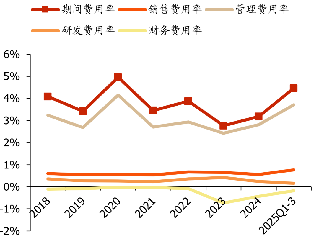 收入规模扩张带动期间费率下行。2018-2024年公司期间费用率总体呈下行趋势,主要得益于营收增长带动管理费用率下行(薪酬等费用相对刚性)。2025Q1-3公司期间费用率4.46%,同增1.4pct,其中销售/管理/研发/财务费用率分别为0.77%/3.71%/0.16%/-0.17%,同比 0.16/ 1.06/-0.11/ 0.28pct,管理费用率提升较多,主要因收入同比下滑较多,叠加激励计划产生较多股权支付费用。