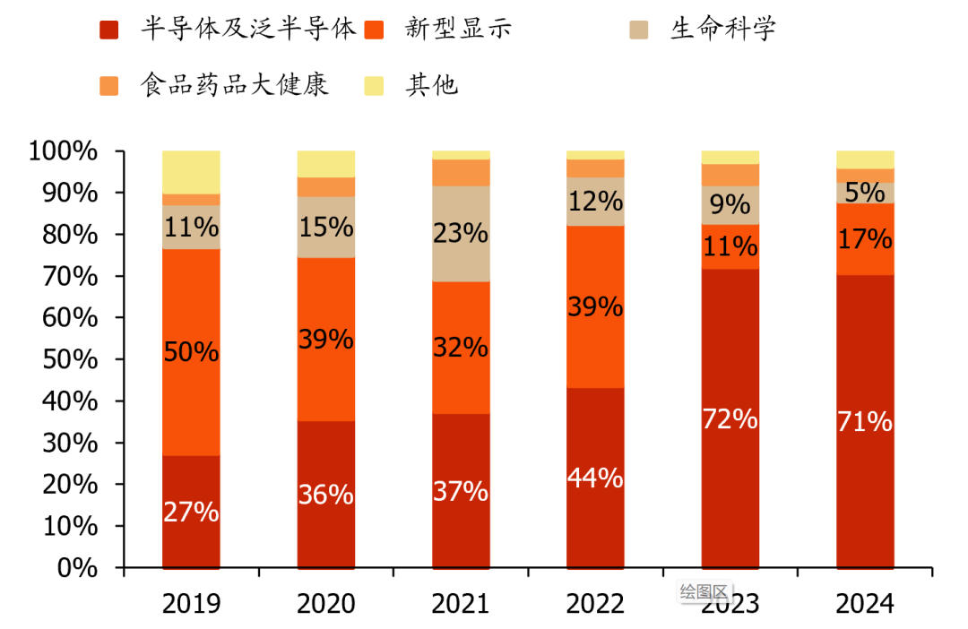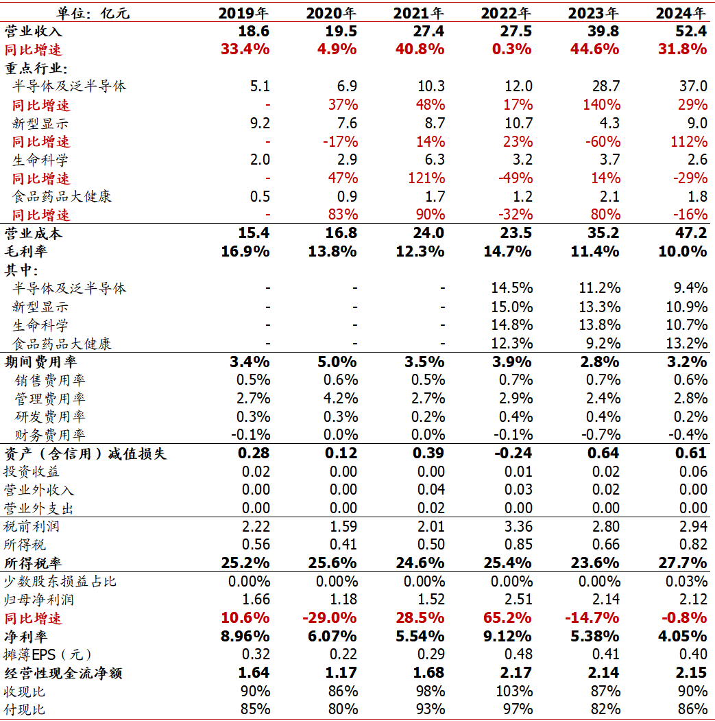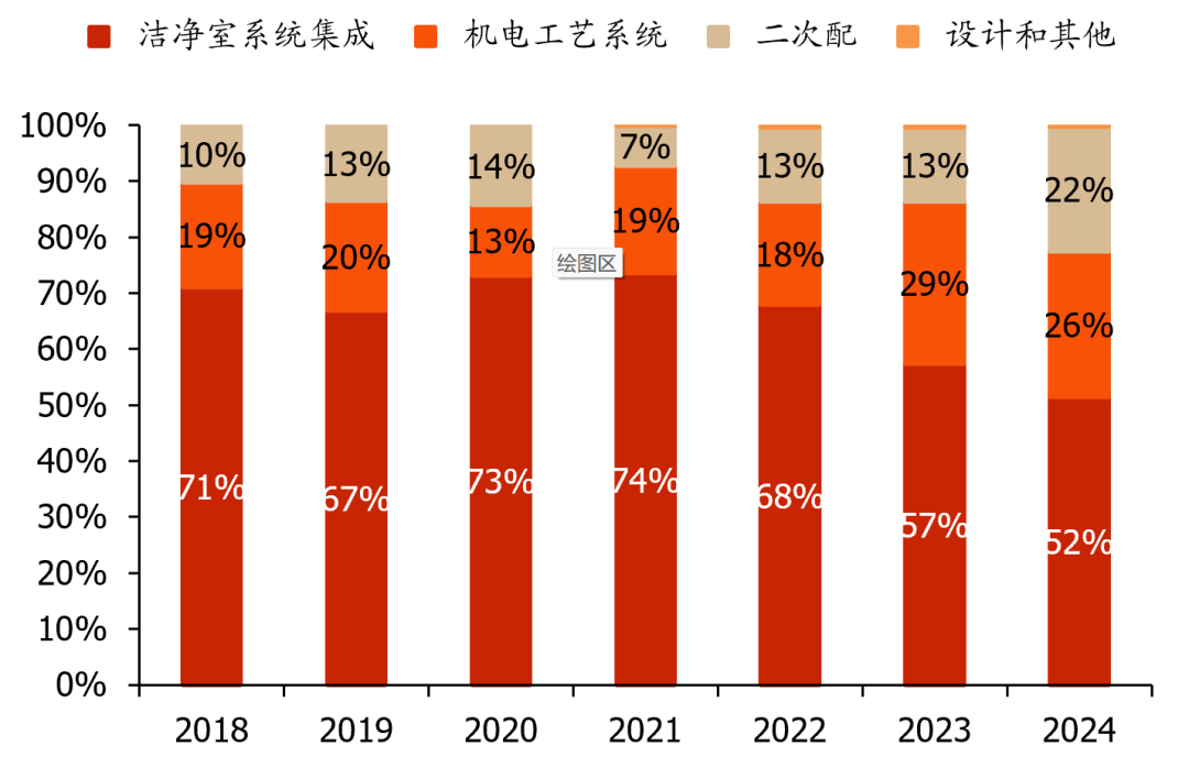 公司主要为高科技产业的建厂、技改项目提供洁净室系统集成服务,业务覆盖项目规划设计、采购、系统集成、二次配、运行维护全产业链,其中洁净室系统包括结构系统(保证洁净室正压或负压)、通风空调系统、电气系统、消防系统、洁净室控制系统、防微震系统等;二次配指在洁净环境下,将工艺系统从一次系统与各种工艺设备有效连结,确保各工艺设备有效运行。2024年洁净室系统集成、机电工艺、二次配收入分别占比52%/26%/22%。分行业看,公司下游覆盖半导体、新型显示、生命科学、食品药品大健康、其他行业五大板块,2024年占比分别为71%/17%/5%/3%/4%,2023年起半导体领域占比显著提升,贡献主要收入。