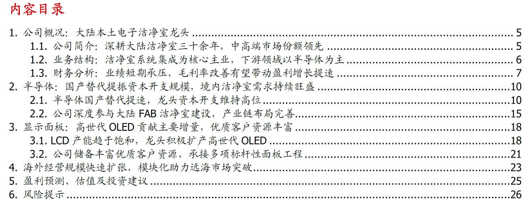 风险提示:模块化业务拓展不及预期、半导体及面板行业资本开支下行风险、行业竞争加剧风险、数据滞后性风险。
