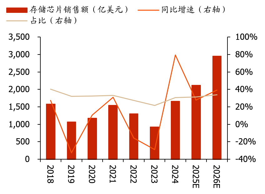 图表22:全球存储芯片销售额及同比增速