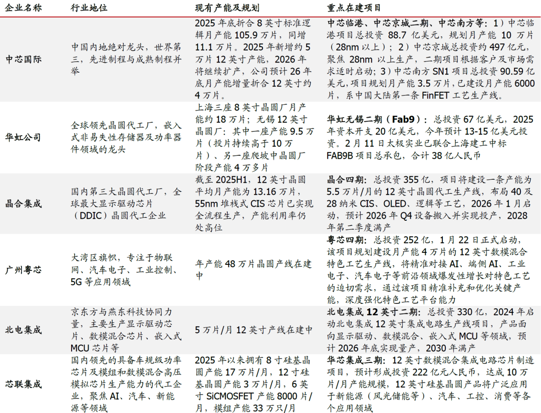 龙头资本开支维持高位,驱动相关建设投资持续旺盛。从大陆晶圆龙头建设规划看,2026年境内半导体资本开支预计维持强劲:1)中芯国际:2025年公司资本开支81亿美元,年底折合8英寸标准逻辑月产能为105.9万片,出货总量970万片,2026年规划继续维持高位,在建重点项目包括中芯京城二期、中芯南方(SN1、SN2)等;2)华虹半导体:无锡Fab9贡献主要资本开支,2025年约20亿美元,2026年预期13-15亿美元投资(EPC环节约38亿人民币,今年2月已由太极实业中标总包);3)其他重点项目包括晶合四期(355亿)、粤芯四期(252亿)、北电集成12英寸二期(330亿)、华芯集成三期(222亿)等,有望带动相关建设投资需求持续旺盛。