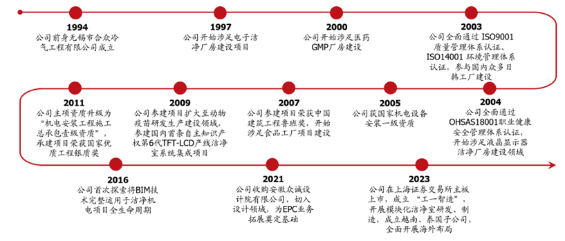 公司前身为1994年成立的无锡市合众冷气工程有限公司,1997年开始涉足电子洁净室厂房建设,2006年改制为股份有限公司。公司深耕洁净室系统集成行业30年,已发展为我国洁净室行业头部企业之一,业务领域覆盖半导体及泛半导体、新型显示、生命科学、食品药品大健康、其他(新能源等)五大板块,为国内少数具备承接多行业洁净室系统的供应商之一,累计承接500余项、350万平洁净室集成项目,综合实力领先。