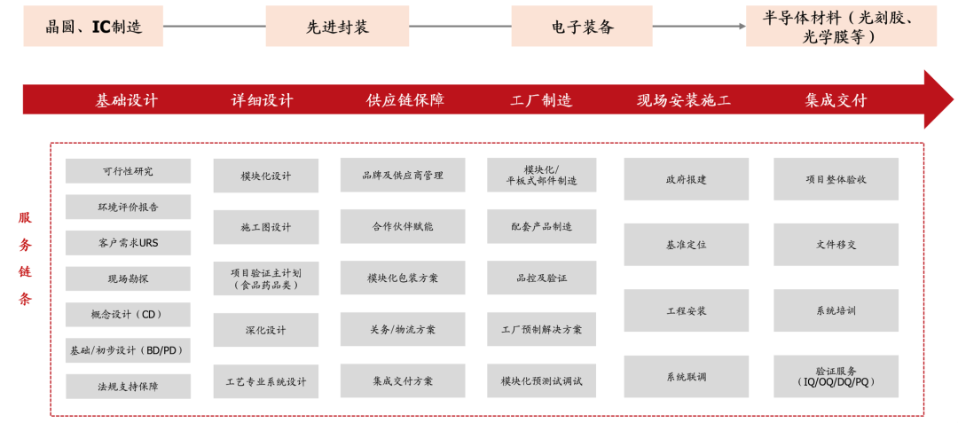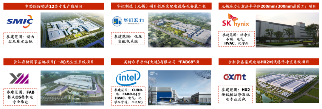 公司深度参与境内高端FAB洁净室建设,产业链布局完善。公司于1997年参与首个电子洁净厂房建设项目(大连东福),2003年参与国内众多日韩工厂建设(东莞三星、无锡松下、普利司通等)借鉴、学习日韩精细化项目管理模式,2005年起全面承接半导体行业大规模、高级别洁净厂房建设(无锡海力士),后陆续参加2013西安三星项目、2019年长鑫项目(国内第一个量产DRAM芯片基地)等,积累中芯国际、长鑫存储、长江存储、华虹半导体等多家优质客户。当前公司已构建电子洁净室EPFC全产业链,可提供系统功能性需求分析、项目策划及设计、采购管理、洁净室系统集成、二次配管配线、生产设备试运行、竣工交付及系统运行维护等服务,产业链布局完善,业内影响力突出。