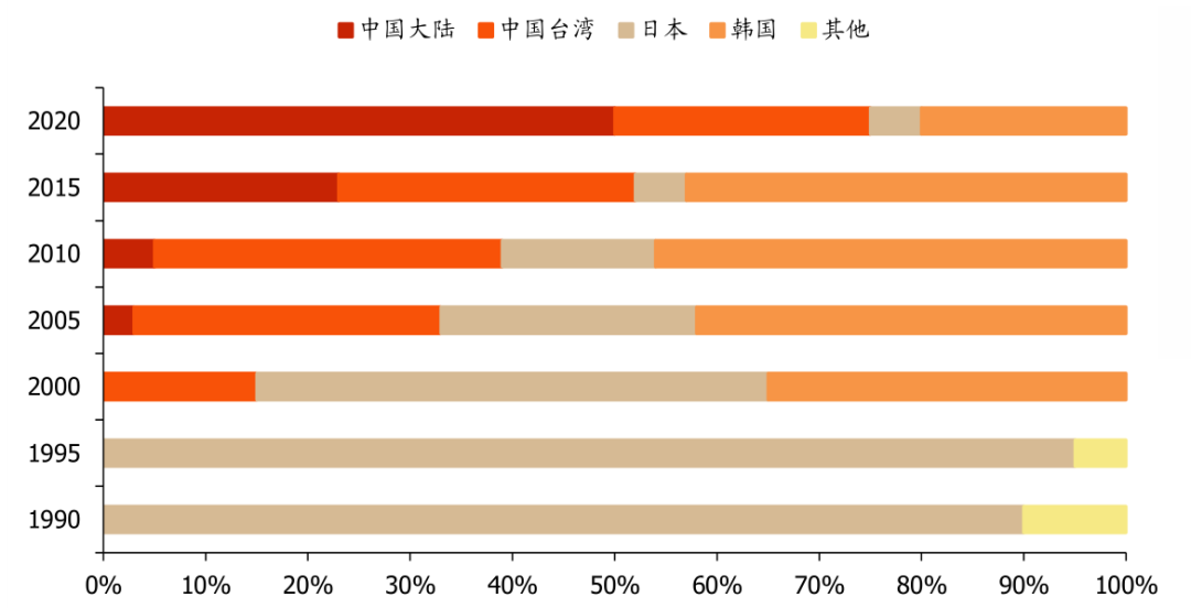 图表34:1990-2020年全球LCD产能区域结构变化情况