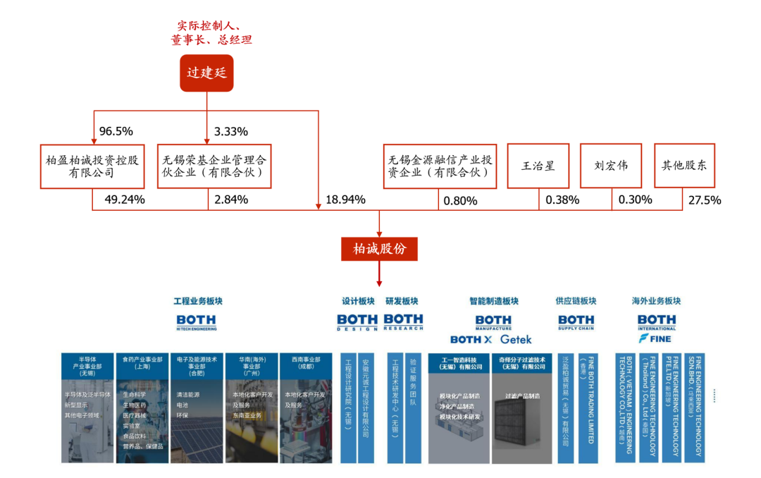 股权结构稳定,控制权集中于实控人。截至2025Q3末,公司第一大股东为柏盈柏诚投资控股(无锡)有限公司,持股比例49.24%;公司董事长、总经理过建廷通过柏盈控股和无锡荣基合计实现71.02%控制权,为公司实际控制人。公司旗下分工程、设计、研发、智能制造、供应链、海外业务六大板块,其中工程业务包括半导体产业(无锡)、食药产业(上海)、电子及能源技术(合肥)、华南海外(广州)以及西南(成都)五大事业部;智能制造板块包括无锡工一智造科技(模块化产品)以及奇绎分子过滤技术(过滤产品制造)两大子公司。