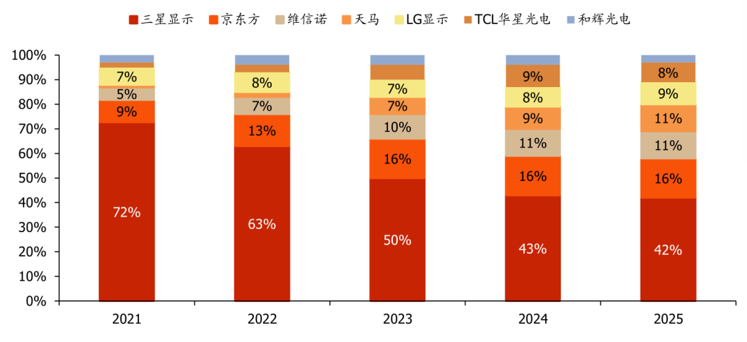 面板龙头积极扩产高世代OLED,国内厂商市占率持续提升。高世代OLED是行业主流趋势,8.6代线基板尺寸更大,适配平板、笔电等中大尺寸产品,生产效率更高、成本更低,技术壁垒突出。三星显示已率先落地全球首条8.6代OLED产线,其牙山工厂A6产线于2026年1月15日正式量产出货,该产线由原LCD产线改造、总投资约195亿元,良率已达客户验证标准;国内京东方、维信诺、TCL华星等面板龙头同步扩产,密集布局8.6代OLED产线,京东方预计2026年下半年量产、维信诺主厂房已封顶、TCL华星项目开工,多条产线逐步迈向量产,后续国内厂商市占率预计持续提升。据CINNO Research数据,2025年AMOLED手机面板出货量中,三星显示市占率已由2021年的72%大幅降低至42%,京东方、维信诺、天马等国内面板厂商份额持续提升,2025年合计市占率提升至年50.6%,后续随着高世代OLED逐步投产,国内龙头市场份额有望持续增长。