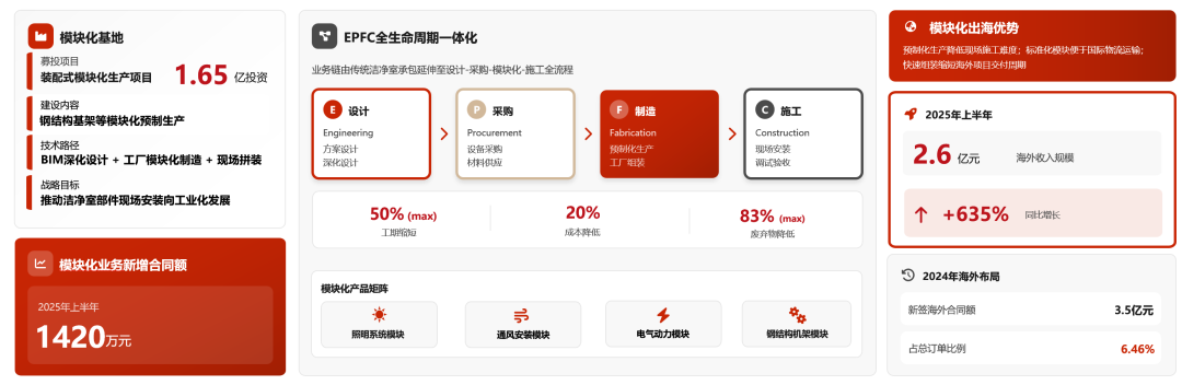 由传统EPC延伸至EPFC全产业链,后续将进一步推动模块化产品出海。近年来公司逐步将业务链由传统洁净室承包延伸至EPFC(设计-采购-制造-施工)全生命周期一体化,采取“现场安装施工 工厂模块化制造”混合交付模式,提升服务质量与效率。当前围绕行业及客户需求,公司已形成预制模块化、功能性模块化、模块化配套净化三大产品板块,在部分大型电子及生物医药洁净室中推广应用,2025上半年新增模块化合同额1420万元。后续公司计划在海外大力拓展模块化业务,依托国内高效制造能力、完善供应链体系以及充足产业配套资源实现“中国智造、国际标准、全球交付”。