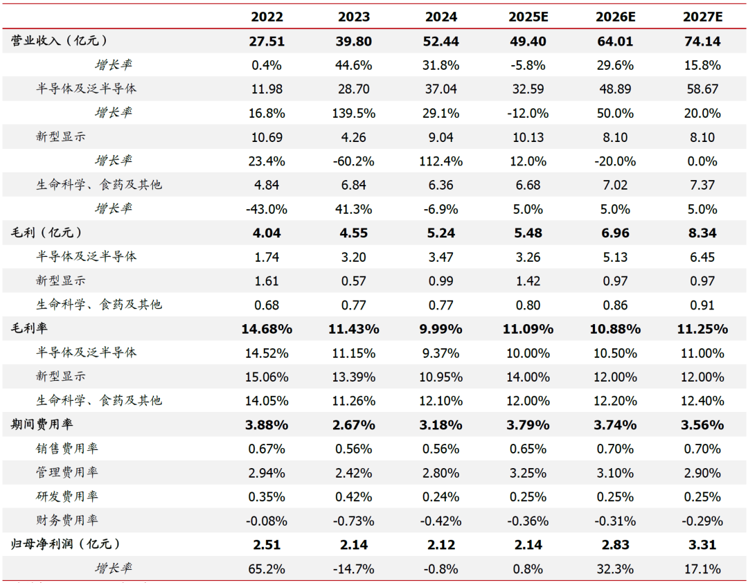 营业收入:预计2025-2027年公司分别实现营业收入49.40/64.01/74.14亿元,同比-5.8%/ 29.6%/ 15.8%。公司项目执行周期较短,基本6-12月内陆续确认收入,因此当年营收与行业签单景气基本趋同:1)半导体及泛半导体:2025上半年受境内需求下行影响,板块营收同降23%,预测2025全年维持下滑趋势,同降12%;2026年起中芯国际、华虹、长存、长鑫等境内龙头资本开支加码,需求预计显著改善,假设2026-2027年板块营收分别同增50%/20%,对应2025-2027年营收分别为32.59/48.89/58.67亿元。2)面板显示:2024年公司中标京东方8.6代AMOLED产线洁净工程,预计带动2025年面板收入增长,2026年预计在高基数上下滑、2027年维持稳定,我们假设2025-2027年分别同比 12%/-20%/0%,对应2025-2027年板块营收分别为10.13/8.10/8.10亿元。3)生命科学、食药及其他:整体占比较小,假设2025-2027年维持稳健增长,每年同比增速5%,对应营收6.68/7.02/7.37亿元。