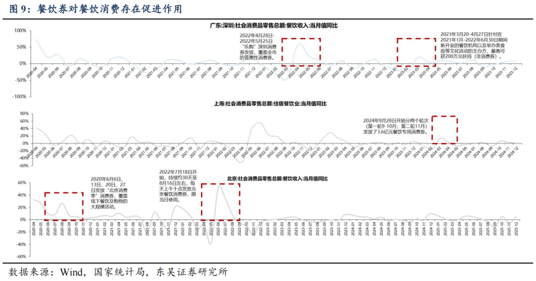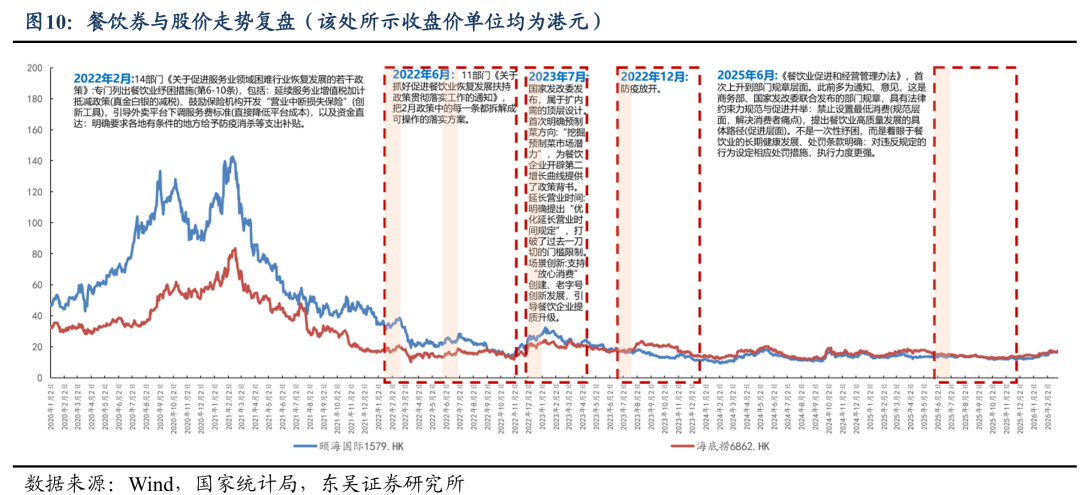 复盘餐饮券等刺激政策与社零餐饮收入、股价表现的影响,①该类事件往往带来当期餐饮表现的直接提振,但如前所述,消费者信心的中长期修复仍是个慢变量;②大范围的餐饮支持政策短期对情绪面有改善,但对餐饮股价的趋势性影响偏小,股价更多受到公司基本面及行业β的综合影响。