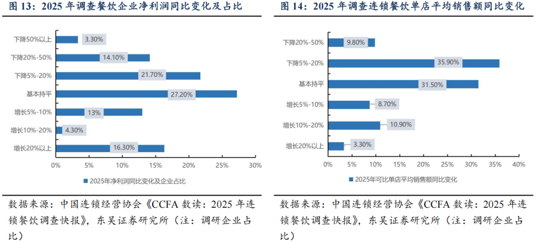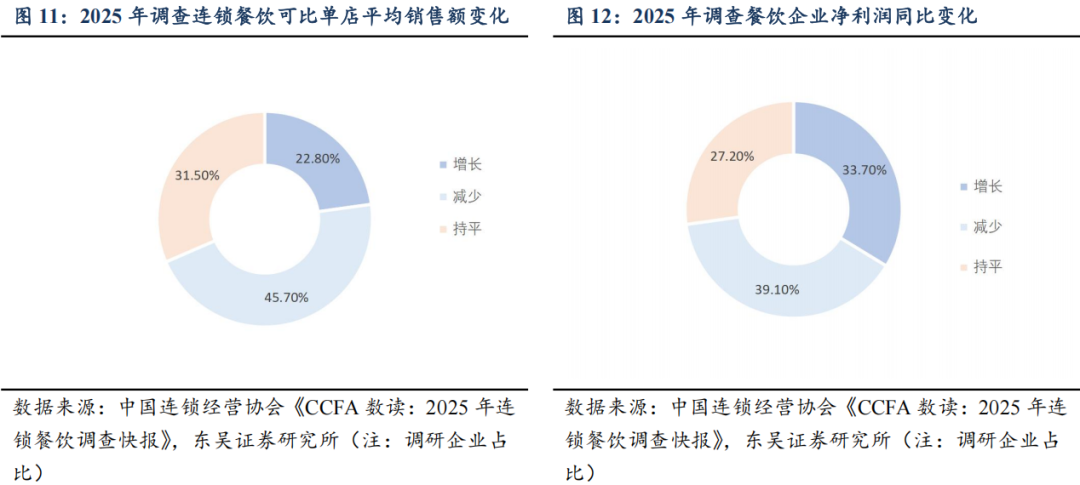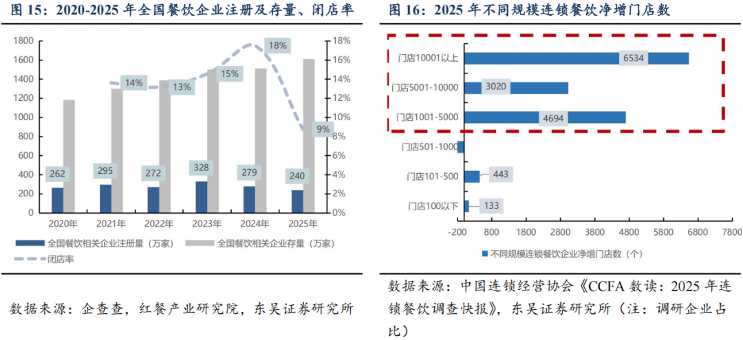 格局向好,品牌分化。据中国连锁经营协会《CCFA数读:2025年连锁餐饮调查快报》,2025年可比单店平均销售额趋平淡是普遍现象,大部分受访连锁餐饮企业2025年净利润同比持平微降(下降20%以下)。开闭店而言,2023年后新企业注册量递减、闭店率高峰(2024年)已过,行业格局趋稳。以2025年为例,净增门店明显头部集中,门店10001家以上的餐饮企业净增门店显著领先,单年度达6534家、门店数量1000家及以下的餐饮品牌新开策略归于谨慎,甚至部分类型略有收缩。