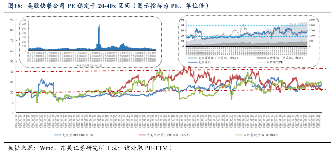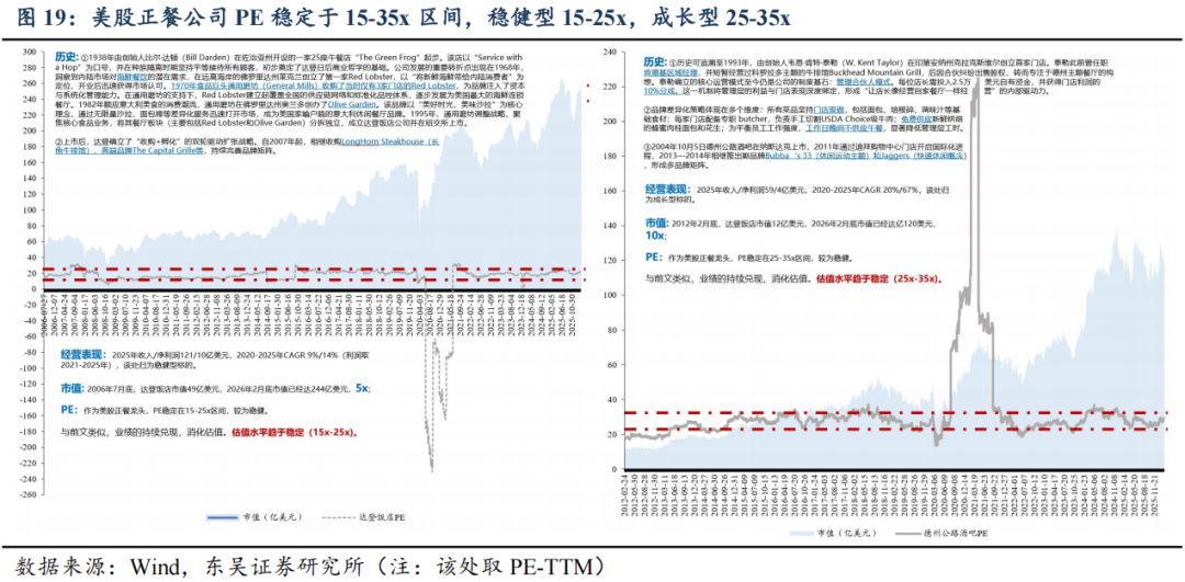 (2)美股正餐公司:美股正餐公司PE基本位于15-35xPE,稳健型15-25x,成长型25-35x。