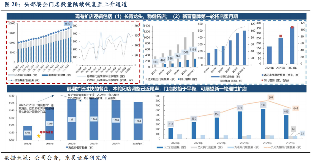 共性二:头部餐企门店数量陆续恢复至上升通道。分为两个类型:①拓店逻辑:现有拓店逻辑包括长青龙头,稳健拓店(如百胜);以及处于第一轮拓店蜜月期的新晋品牌(如达势、绿茶、遇见小面);②前期扩张过快的餐企,本轮闭店已近尾声,门店数趋于平稳,可展望新一轮理性拓店。