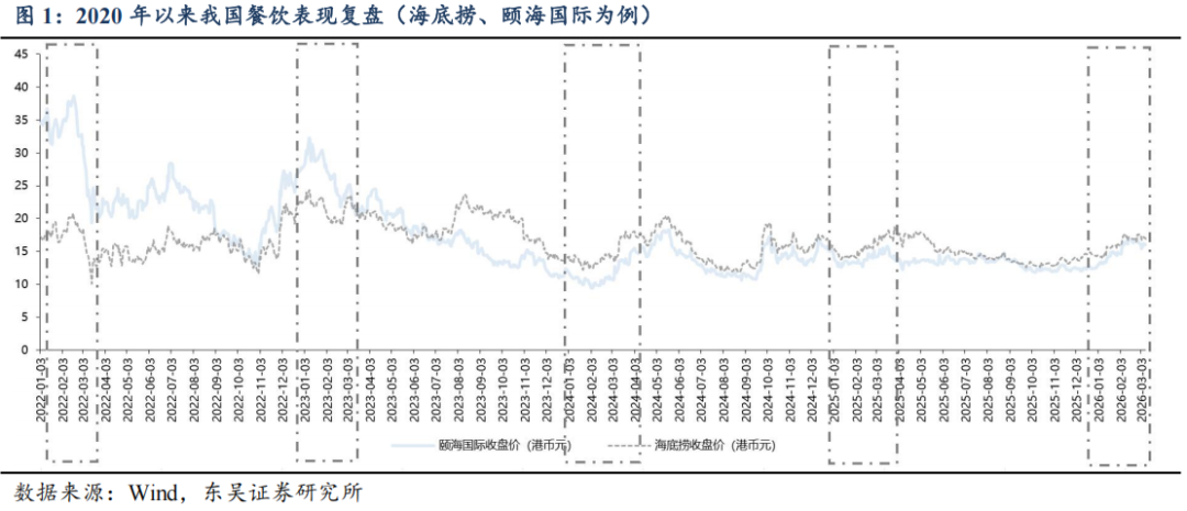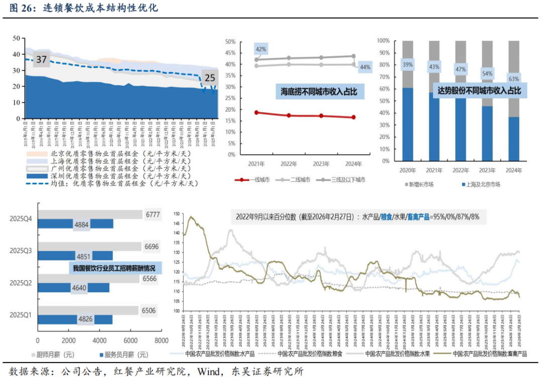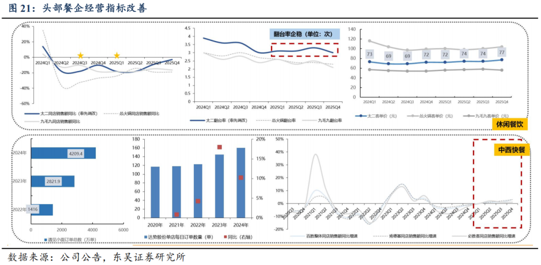 头部品牌分化,但均步入正轨:①共性一:估值低。截至2026年2月26日,西式快餐品牌百胜/达势PE分别21x/70x,处历史分位数41%/1%;休闲餐厅品牌绿茶集团/九毛九PE分别11x/61x,处历史分位数58%/45%;火锅及正餐品牌海底捞/广州酒家PE分别20x/20x,处历史分位数30%/21%。复盘美股股价表现,2010年以来快餐龙头PE常年稳定在20-40x区间,百胜及麦当劳2006年至今市值分别实现了约5倍和3倍的增长,其业绩的持续稳健兑现有效消化估值。②共性二:头部餐企门店数量陆续恢复至上升通道。一为拓店逻辑,包括长青龙头,稳健拓店(如百胜);以及处于第一轮拓店蜜月期的新晋品牌(如达势、绿茶、遇见小面);二为前期扩张过快的餐企,本轮闭店已近尾声,门店数趋于平稳,可展望新一轮理性拓店。③共性三:经营数据转好,多数连锁餐饮门店同店表现(或者TC)逐步转好;客单价亦有企稳态势。④共性四:积极寻找第二成长曲线,新品牌/新店型可圈可点。新品牌代表海底捞,开设焰请烤肉铺子、举高高(单人自助旋转小火锅)、如鮨寿司等;新店型代表如百胜中国、九毛九、绿茶集团。⑤共性五:成本结构性优化,主要优化项在于租金成本。⑥共性六:AI数字化、供应链提效。