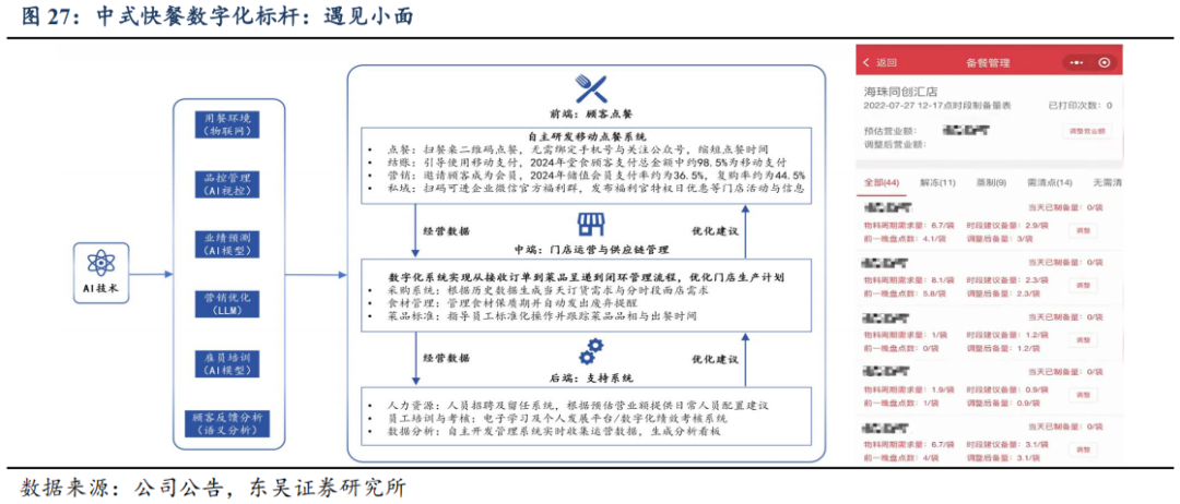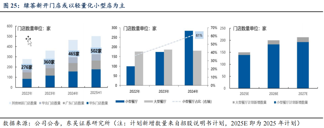 ③绿茶集团:关键词“轻量化”。公司处拓店红利期,开店目标积极。同时持续精简店型,提升效率,2022年开始将“小型餐厅”作为扩张主线,“轻量化”的小型餐厅主要面向二三线及以下城市核心商圈及交通枢纽,保留核心菜品的同时,将菜单数量压降至45-50款,新增一人食小份菜及下午茶甜品。小型餐厅翻台率较高且经营成本较低,据公告,截至2024年底,小型餐厅数量已达284家,占比整体餐厅数量的61%,我们预计2025-2027年新增门店仍以小型店为主。