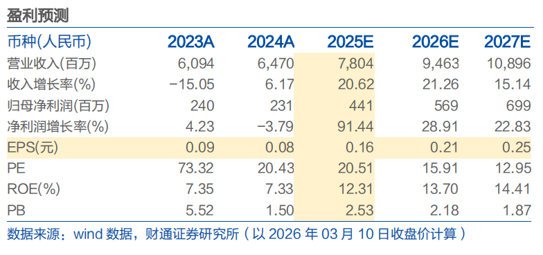 投资建议:我们预计公司2025-2027年实现收入78.04/94.63/108.96亿元,同比 20.62%/ 21.26%/ 15.14%,归母净利润4.41/5.69/6.99亿元,同比 91.44%/ 28.91%/ 22.83%,对应PE 21/16/13x,首次覆盖,给予公司“买入”评级。