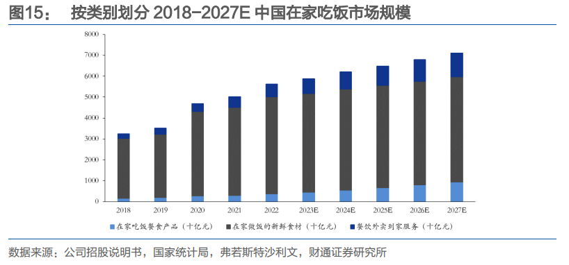 对中国在家吃饭市场按类别划分,餐食产品市场规模2022年达3673亿元,占国内在家吃饭市场的6.5%, 2018-2022年CAGR为25.5%,显著高于整体餐饮行业7.8%的同期增速。受益于“懒人经济”、健康饮食需求、消费升级和冷链基建的完善,消费者对高效烹饪和便捷优质餐食的需求显著增长,推动了在家吃饭餐食产品市场的快速发展。根据弗若斯特沙利文数据,预计2022-2027年在家吃饭餐食产品CAGR为20.7%,2027年市场规模有望突破9400亿元,成为在家吃饭场景中增长最快的细分赛道。