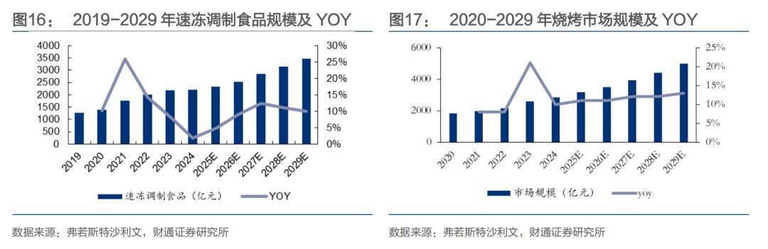 在家吃饭餐食产品细分市场中包括即食、即热、即烹、即配四大类,各品类食材均能提高家庭日常烹饪效率。其中速冻调制食品是在家吃饭餐食产品市场的重要组成部分,广泛应用于火锅、麻辣烫、烧烤等消费场景。根据弗若斯特沙利文数据,2024年我国速冻食品行业规模为2212亿元,其中速冻调制食品规模达565亿元,占比超25%,在火锅、麻辣烫等餐饮多元化需求驱动下,预计2024-2029年复合增长率为7.2%;2024年烧烤行业整体规模为2848亿元,伴随露营等户外场景兴起,相关速冻调制食品需求持续扩大,增速有望进一步提升。