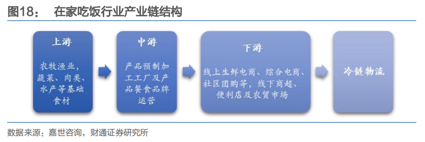 目前,我国在家吃饭行业已经形成较为完整的产业链体系,是由上游原料供应、中游生产加工、下游销售渠道及贯穿全程的支撑体系构成的现代化协同网络。1)上游以农牧渔业为核心,提供蔬菜、肉类、水产等基础食材,辅以调味品、包装材料等辅料供应,其价格与品质直接决定中游产品的成本与质量;2)中游作为产业链核心环节,聚焦预制菜(即食、即热、即烹)、复合调味料、速冻食品等多元餐食的生产加工,通过锁鲜技术、自动化生产等食品工业化手段,提升产品口味、安全标准与标准化水平,同时包含餐食品牌的运营推广;3)下游通过线上(生鲜电商、综合电商、社区团购)与线下(商超、便利店、农贸市场)两大类渠道触达消费者,以便捷高效的服务满足“即时性”消费需求;4)冷链物流、仓储服务、食品安全监管等环节则保障产业链各环节紧密协同、高效运作。