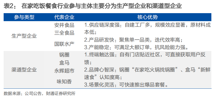 目前在家吃饭餐食行业参与主体主要分为生产型企业和渠道型企业,生产型企业优势在于供应链与产品研发能力较强,聚焦于食材生产制造环节;而渠道型企业以锅圈、盒马、永辉超市等为代表,通过自有门店或线上平台直接触达C端,产品以自有品牌为主,受益于线下零售调改与线上即时零售的快速发展,近年增长势头更猛。